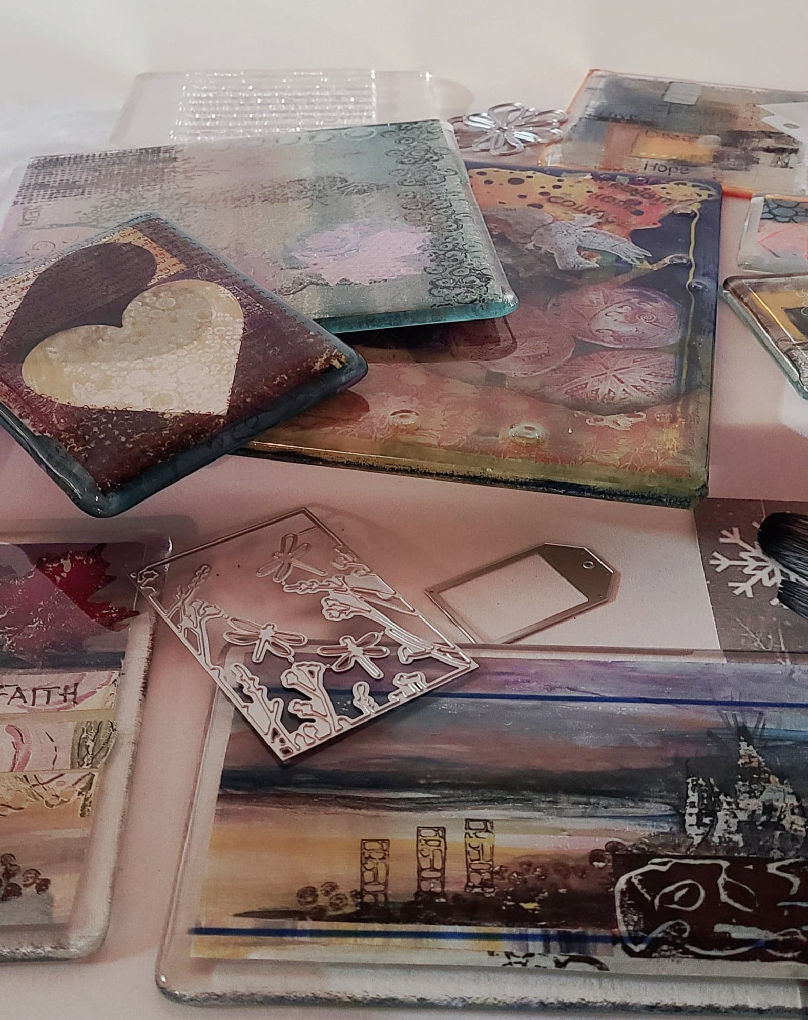 Experiment with new, inventive techniques in utilizing mixed media (decals, stamping, textures, layering) in your fused glass art. Adopt a playful approach to creating new work, having fun along the way.